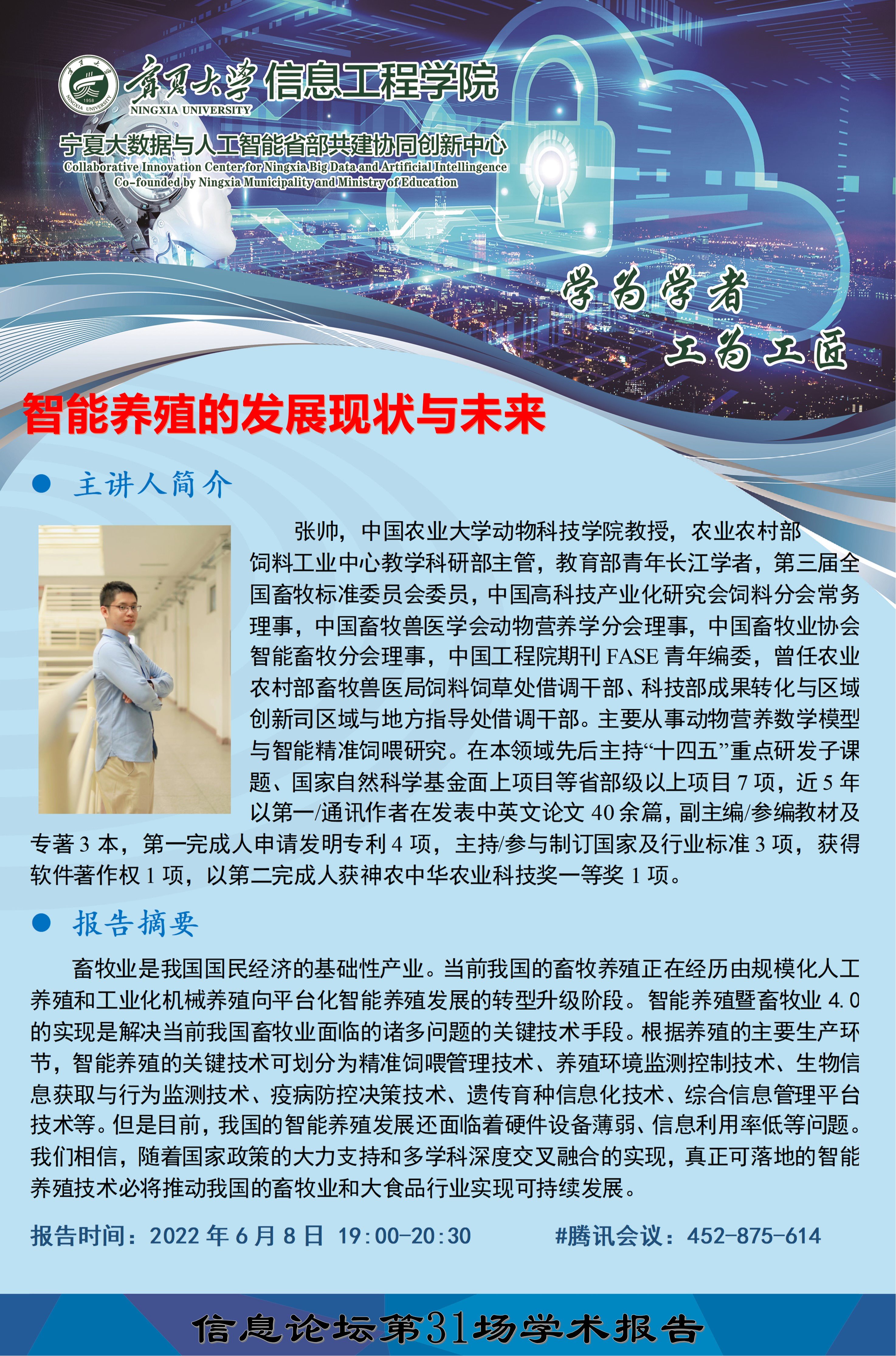 报告时间:2022年6月8日(星期三)晚上19:00-20:30(线上)#腾讯会议:452-875-614报告题目:智能养殖的发展现状与未来报告人简介:张帅,中国农业大学动物科技乐鱼(中国)教授,农业农村部饲料工业中心教学科研部主管,第三届全国畜牧标准委员会委员,中国高科技产业化研究会饲料分会常务理事,中国畜牧兽医学会动物营养学分会理事,中国畜牧业协会智能畜牧分会理事,中国工程院期刊FASE青年编委,曾任农业农村部畜牧兽医局饲料饲草处借调干部、科技部成果转化与区域创新司区域与地方指导处借调干部。主要从事动物营养数学模型与智能精准饲喂研究。在本领域先后主持“十四五”重点研发子课题、国家自然科学基金面上项目等省部级以上项目7项,近5年以第一/通讯作者发表中英文论文40余篇,副主编/参编教材及专著3本,第一完成人申请发明专利4项,主持/参与制订国家及行业标准3项,获得软件著作权1项,以第二完成人获神农中华农业科技奖一等奖1项。报告摘要:畜牧业是我国国民经济的基础性产业。当前我国的畜牧养殖正在经历由规模化人工养殖和工业化机械养殖向平台化智能养殖发展的转型升级阶段。智能养殖暨畜牧业4.0的实现是解决当前我国畜牧业面临的诸多问题的关键技术手段。根据养殖的主要生产环节,智能养殖的关键技术可划分为精准饲喂管理技术、养殖环境监测控制技术、生物信息获取与行为监测技术、疫病防控决策技术、遗传育种信息化技术、综合信息管理平台技术等。但是目前,我国的智能养...