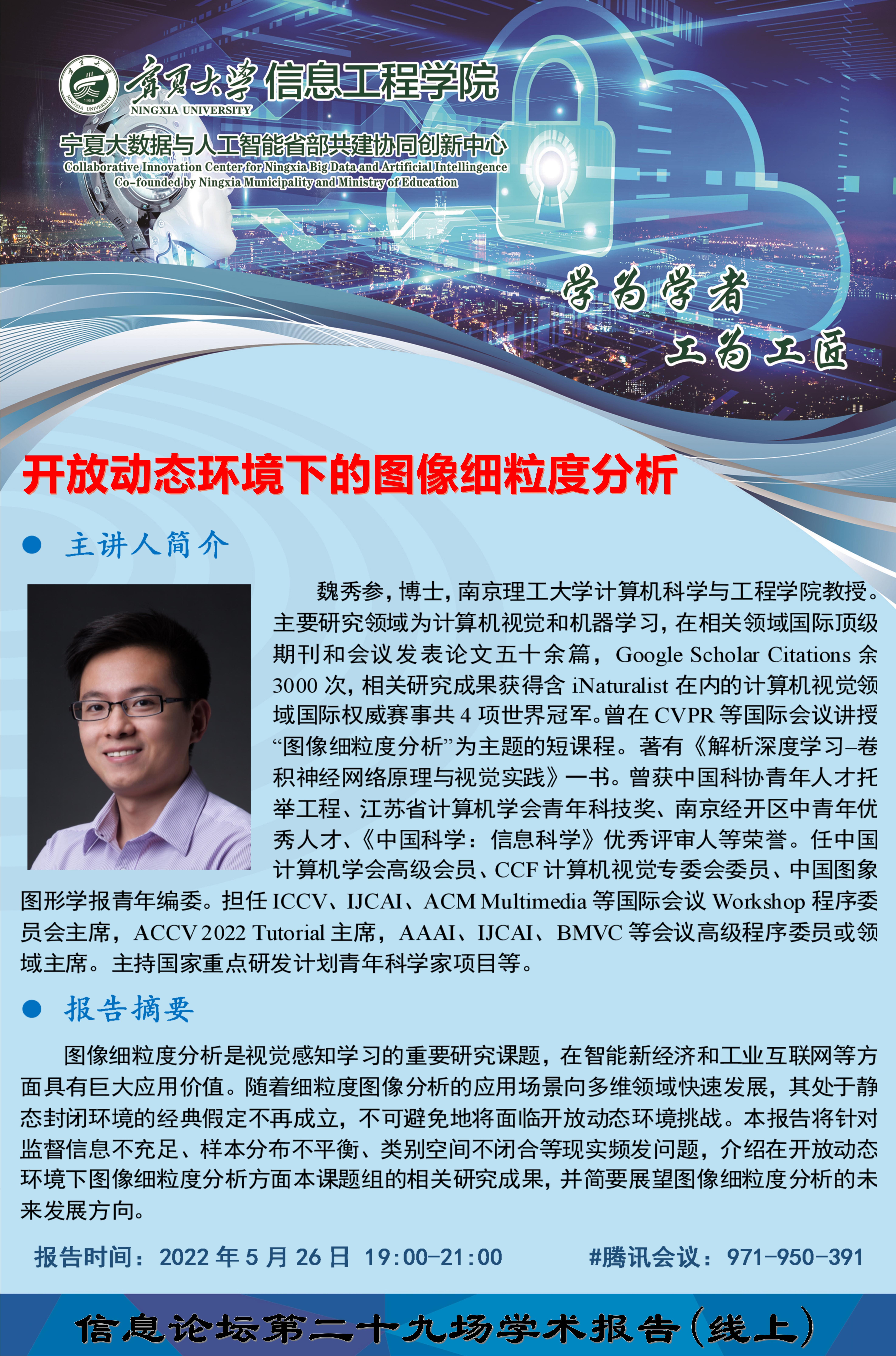 报告时间:2022年5月26日(星期四)晚上19:00-21:00(线上)#腾讯会议:971-950-391题目:开放动态环境下的图像细粒度分析摘要:图像细粒度分析是视觉感知学习的重要研究课题,在智能新经济和工业互联网等方面具有巨大应用价值。随着细粒度图像分析的应用场景向多维领域快速发展,其处于静态封闭环境的经典假定不再成立,不可避免地将面临开放动态环境挑战。本报告将针对监督信息不充足、样本分布不平衡、类别空间不闭合等现...