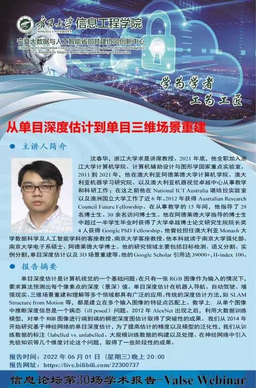 论坛时间:2022年06月01日(星期三)晚上20:00 (北京时间)主 题:从单目深度估计到单目三维场景重建主 持 人:刘昊(宁夏大学)直播网址:https://live.bilibili.com/22300737报告嘉宾:沈春华(浙江大学)报告时间:2022年06月01日(星期三)晚上20:00 (北京时间)报告题目:从单目深度估计到单目三维场景重建沈春华,浙江大学求是讲席教授。2021年底他全职加入浙江大学计算机乐鱼(中国)、计算机辅助设计与图形学国家重点实验室。2011到2021...