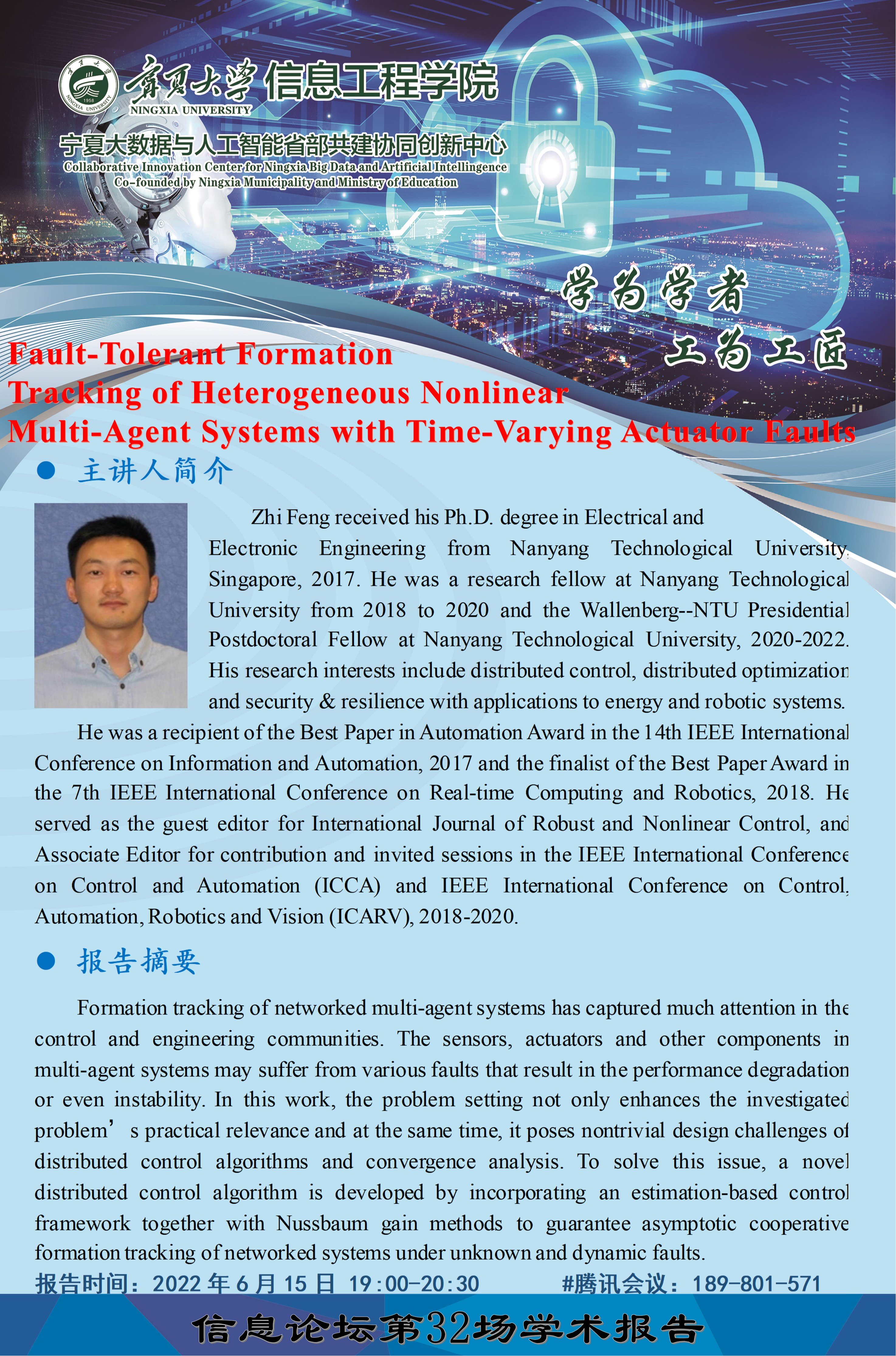 报告时间:2022年6月15日(星期三)晚上19:00-20:30(线上)#腾讯会议:189-801-571报告题目:Fault-Tolerant Formation Tracking of Heterogeneous Nonlinear Multi-Agent Systems with Time-Varying Actuator Faults Abstract: Formation tracking of networked multi-agent systems has captured much attention in the control and engineering communities. The sensors, actuators and other components in multi-ag...