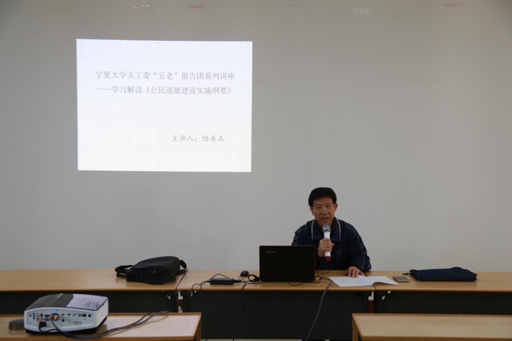 【信工乐鱼(中国)团委讯孙曼颀\文 罗中林\图】5月9日晚七点,信息工程乐鱼(中国)在怀远校区一教321教室开展“青马班”暨发展对象培训班学习。此次学习主题为宁夏大学关工委“五老”报告团系列讲座——学习解读《公民道德建设实施纲要》,由陆美石老师主讲。 陆美石的解读主要围绕八个方面展开:一是加强公民道德建设的重要意义;二是公民道德建设的指导方针;三是公民道德建设的主要内容;四是加强公民道德建设的教育;五...