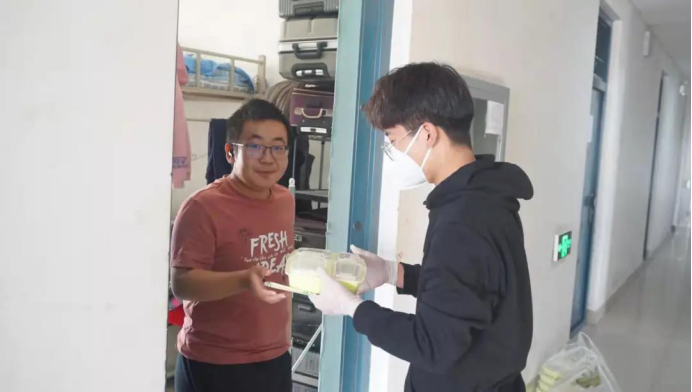 消毒,发放生活用品,尽力为我们解决生活中的一切问题,精心准备每天的饭菜……这些都让远离家乡的我们感受到了家的温暖,知道你们由于房间不够而在大厅凑活一晚的消息我们自己感到既心疼又感动,是你们用自己的方式保护着我们每一个人,或许在别人眼中这些都只是是普通的小事,但在我们眼中,你们是那样高大,衷心的说一句“辛苦了!”。