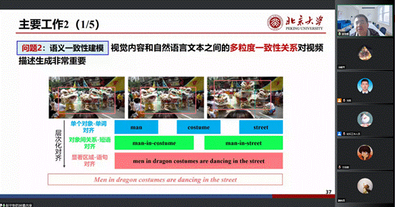 彭宇新教授报告题目为“视觉-语言相互生成技术”,他以视觉-语言相互生成技术作为主题。他介绍了人脑认知的跨媒体特性、跨媒体智能与传统人工智能的区别以及跨媒体智能的7个主要任务,使与会师生对跨媒体智能有了宏观的认识,紧接着他还对视觉-语言相互生成技术做了详细的讲解,并分享团队近期在视觉-语言相互生成技术上的研究进展及相关成果,最后他还展示了相关的演示系统。