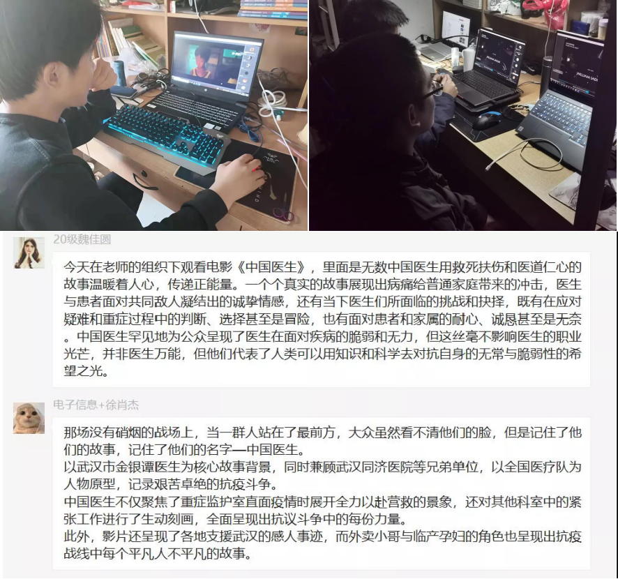 观影后,各临时团支部团员通过分享观后感,在线谈观后感等形式,畅享个人观影心得,纷纷表示要以先锋模范为榜样,将家国情怀、奉献精神牢记于心,将抗疫精神发扬在生活的方方面面。