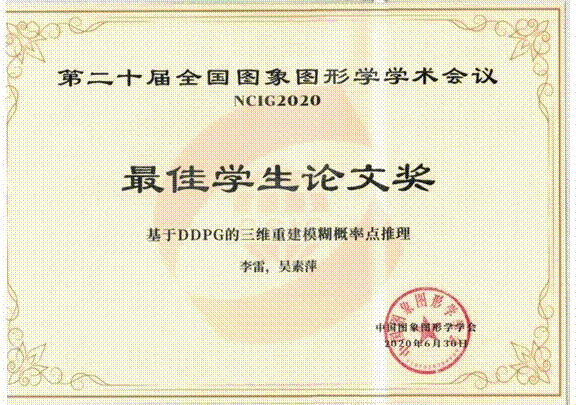 近日,信息工程乐鱼(中国)2019级硕士研究生李雷完成的学术论文《基于DDPG的三维重建模糊概率点推理》被国内计算机学科一级学报《自动化学报》录用并优先出版。《自动化学报》(ACTA AUTOMATICA SINICA)是中国计算机学会(CCF)认定的CCF-A类中文科技期刊。同时该论文还被“中国图象图形学会”举办的全国图象图形学学术会议(NCIG)评为“最佳学生论文奖”。该论文由信息工程乐鱼(中国)吴素萍教授指导。这是信息工程乐鱼(中国)本年度继2019级硕士研...